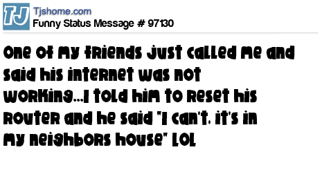 X is One of my friends just called me and said his internet was not working...I told him to reset his router and he said "I can't, it's in my neighbors house" LOL