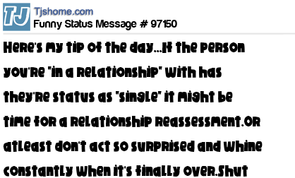 X is Here's my tip of the day...If the person you're "in a relationship" with has they're status as "single" it might be time for a relationship reassessment.Or atleast don't act so surprised and whine constantly when it's finally over.Shut up already,your gro