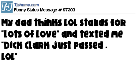 X My dad thinks LOL stands for "Lots Of Love" and texted me "Dick Clark just passed . LOL"