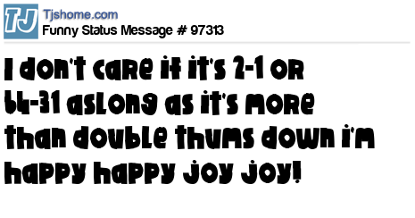 X says I don't care if it's 2-1 or 64-31 aslong as it's more than double thums down i'm happy happy joy joy!