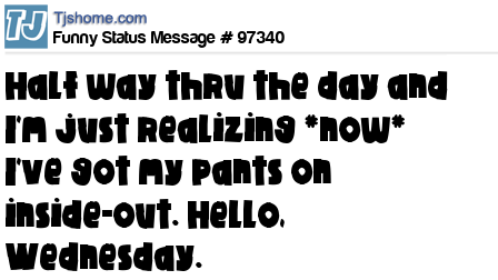X is Half way thru the day and I'm just realizing *now* I've got my pants on inside-out. Hello, Wednesday.