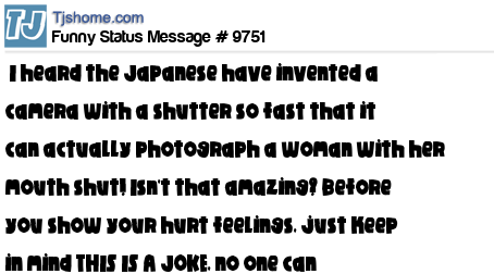 X says I heard the Japanese have invented a camera with a shutter so fast that it can actually photograph a woman with her mouth shut! Isn't that amazing? Before you show your hurt feelings, just keep in mind THIS IS A JOKE, no one can create a camera that FAST
