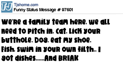 X We're a family team here, we all need to pitch in. Cat, lick your butthole. Dog, eat my shoe. Fish, swim in your own filth.. I got dishes......And BREAK