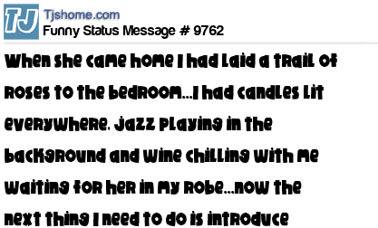 - # 42586 •When she came home I had laid a trail of roses to the bedroom...I had candles lit everywhere, jazz playing in the background and wine chilling with me waiting for her in my robe...now the next thing I need to do is introduce myself......
