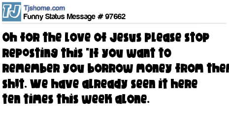 X says Oh for the love of Jesus please stop rep0sting this "If you want to remember you borrow money from them" sh!t. We have already seen it here ten times this week alone.