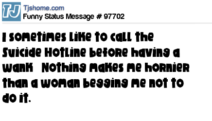 X is I sometimes like to call the Suicide Hotline before having a wank Nothing makes me hornier than a woman begging me not to do it.