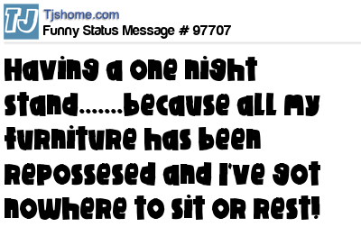 X is having a one night stand.......because all my furniture has been repossesed and I've got nowhere to sit or rest!