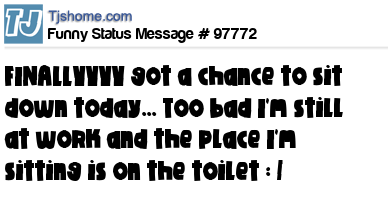 - # 55180 Soo busy today but I FINALLY got a chance to sit down for a minute..... too bad i'm still at work and the place I'm sitting is on the toilet :/