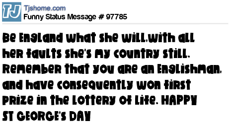 X is Be England what she will,with all her faults she's my country still. Remember that you are an Englishman, and have consequently won first prize in the lottery of life. HAPPY ST GEORGE's DAY