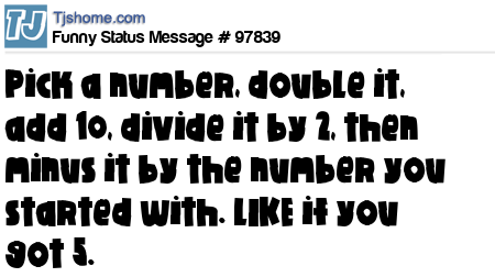 - # 65248 Pick a number, double it, add 10, divide it by 2, then minus it by the number you started with. LIKE if you got 5