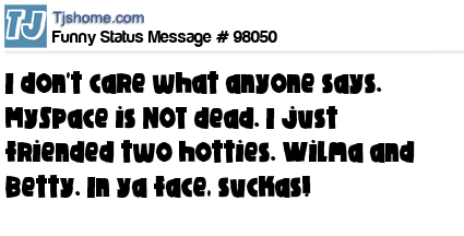 X I don't care what anyone says. MySpace is NOT dead. I just friended two hotties. Wilma and Betty. In ya face, suckas!