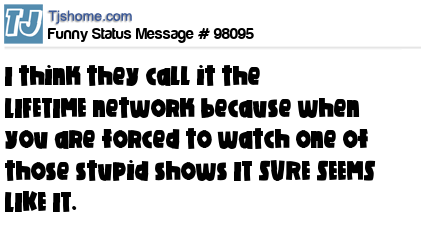 X I think they call it the LIFETIME network because when you are forced to watch one of those stupid shows IT SURE SEEMS LIKE IT.