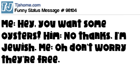 X is Me: Hey, you want some oysters? Him: No thanks. I'm Jewish. Me: Oh don't worry they're free.