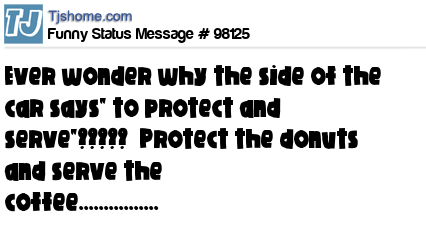 X Ever wonder why the side of the car says" to protect and serve"????? Protect the donuts and serve the coffee................