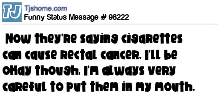 - # 138240 I just read that ciggarettes cause rectal cancer, I should me fine, I was going to put them in my mouth anyway..
