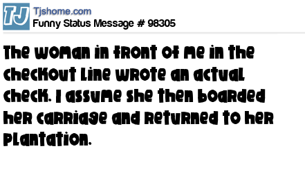 X is The woman in front of me in the checkout line wrote an actual check. I assume she then boarded her carriage and returned to her plantation.