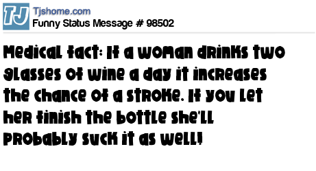 - # 133261 Medical Fact: If a women drinks two glasses of wine a day it increases the chance of a stroke. If you let her finish the bottle she'll probably suck it as well.