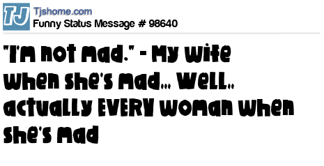 X "I'm not mad." - My wife when she's mad,,, Well,, actually EVERY woman when she's mad