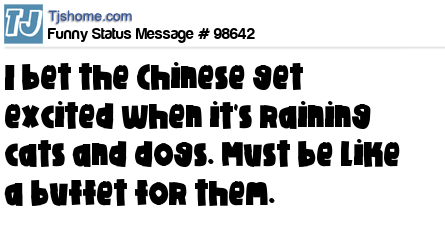 X says I bet the Chinese get excited when it's raining cats and dogs. Must be like a buffet for them.