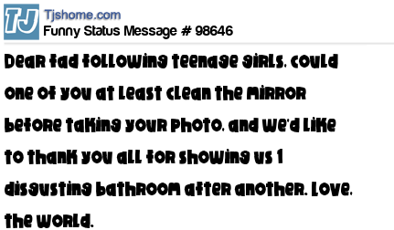 X says Dear fad following teenage girls, could one of you at least clean the mirror before taking your photo, and we'd like to thank you all for showing us 1 disgusting bathroom after another. Love, the world.