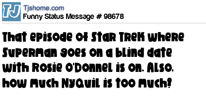 X That episode of Star Trek where Superman goes on a blind date with Rosie O'Donnel is on. Also, how much NyQuil is too much?