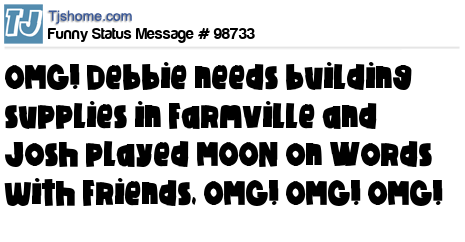 X OMG! Debbie needs building supplies in Farmville and Josh played MOON on Words with Friends, OMG! OMG! OMG!
