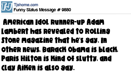 X is American Idol runner-up Adam Lambert has revealed to Rolling Stone magazine that he's gay. In other news, Barack Obama is black, Paris Hilton is kind of slutty, and Clay Aiken is also gay.