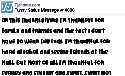 X is On this Thanksgiving I'm thankful for family and friends and the fact I don't have to wear Depends. I'm thankful for hard alcohol and seeing friends at the Mall, But most of all I'm thankful for turkey and stuffin' and SWEET, SWEET HOT LOVIN'!!!!