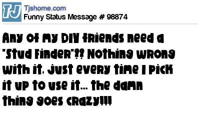 - # 50705 I wonder if I'll ever be mature enough to use a stud finder without first pointing it at every guy on the job and saying, “This thing is broken!!!” (for us females!!! :)