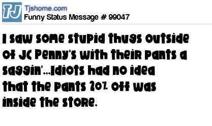 X is I saw some stupid thugs outside of JC Penny's with their pants a saggin'...Idiots had no idea that the pants 20% off was inside the store.