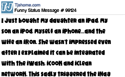 - # 84223 Bought my son an iPad, my daughter an iPod. The wife got me an iPhone and I got her an iRon. She wasn't overjoyed even after I explained that it can be integrated with the iWash, iCook, iClean network. This activated the iNag software update