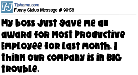 X says My boss just gave me an award for Most Productive Employee for last month. I think our company is in BIG trouble.