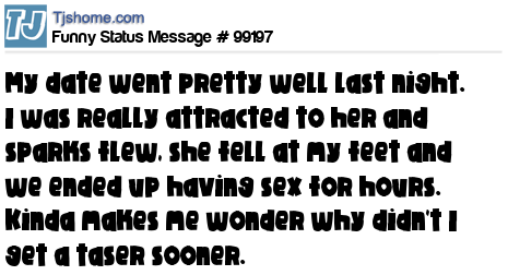 X is My date went pretty well last night. I was really attracted to her and sparks flew, she fell at my feet and we ended up having sex for hours. Kinda makes me wonder why didn't I get a taser sooner.