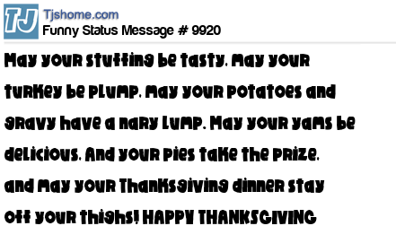 X says May your stuffing be tasty, may your turkey be plump, may your potatoes and gravy have a nary lump. May your yams be delicious, And your pies take the prize, and may your Thanksgiving dinner stay off your thighs! HAPPY THANKSGIVING ALL..........