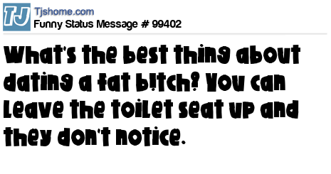 X says What's the best thing about dating a fat b!tch? You can leave the toilet seat up and they don't notice.