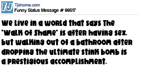 X says We live in a world that says The "Walk of Shame" is after having sex, but walking out of a bathroom after dropping the ultimate stink bomb is a prestigious accomplishment.