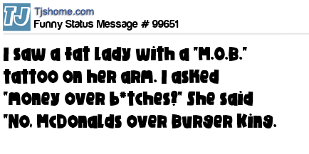 - # 121813 I saw a fat guy with a "M.O.B." tattoo on his arm. I asked "money over b*tches?" He said "No, McDonalds over Burger King.