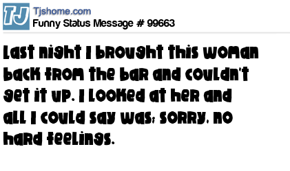 X Last night I brought this woman back from the bar and couldn't get it up. I looked at her and all I could say was; sorry, no hard feelings.