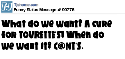 X says What do we want? A cure for TOURETTE'S! When do we want it? C@NT'S.