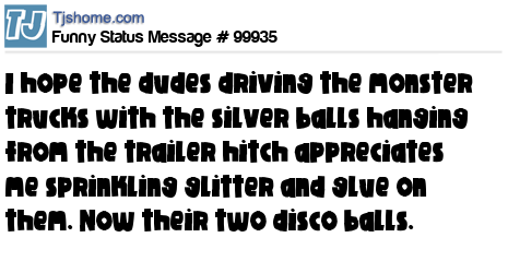 X I hope the dudes driving the monster trucks with the silver balls hanging from the trailer hitch appreciates me sprinkling glitter and glue on them. Now their two disco balls.
