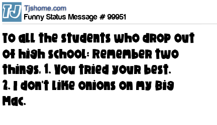 - # 69190 To all the people who failed out of high school, just remember two things: 1) At least you tried your best, and 2) I said NO tomatoes on my burger, b!tch!