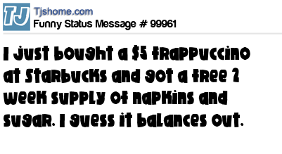 X is I just bought a $5 frappuccino at Starbucks and got a free 2 week supply of napkins and sugar. I guess it balances out.