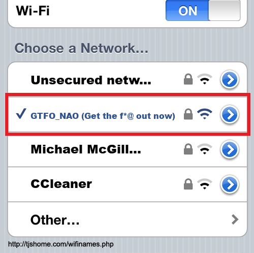 Funny WiFi Name #4564 [GTFO_NAO (Get the f*!@ out now) ]