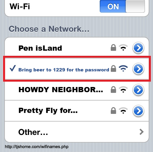 Funny WiFi Name #4758 [Bring beer to 1229 for the password! ]