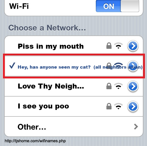 Funny WiFi Name #6192 [Hey, has anyone seen my cat? (all neighbors asian) ]