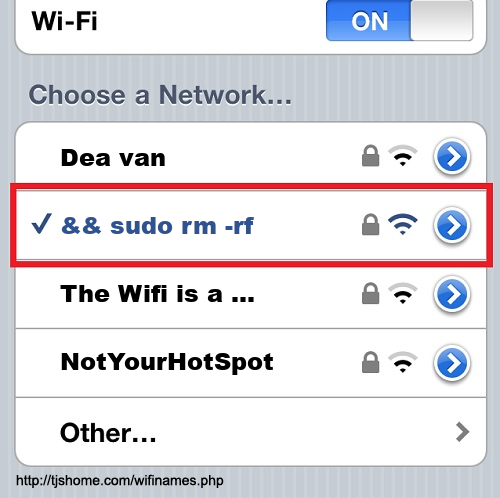 Funny WiFi Name #6741 [&& sudo rm -rf / ]