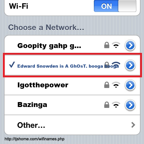 Funny WiFi Name #6837 [Edward Snowden is A GhOsT. booga booga ]