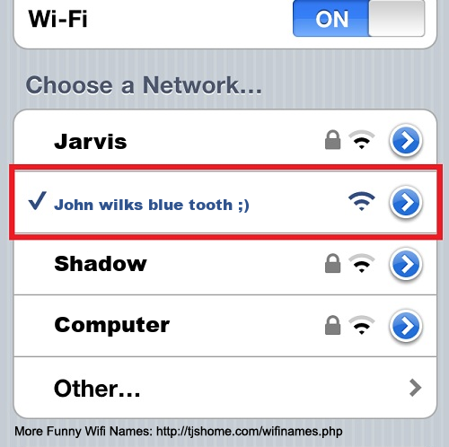 Funny WiFi Name #7129 [John wilks blue tooth ;) ]