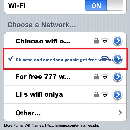 Funny WiFi Name #7435 [Chinese and american people get free wifi forever ]