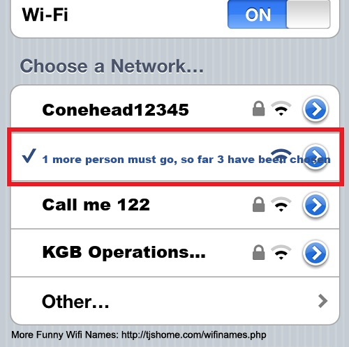 Funny WiFi Name #7485 [1 more person must go, so far 3 have been chosen ]